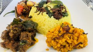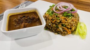 It’s served with a rich, spicy chicken curry, creamy dhal, and the irresistible brinjal moju—a sweet, tangy, and slightly crispy eggplant pickle that ties it all together, this dish is the perfect balance of warmth, spice, and comfort that’ll leave you asking for seconds.