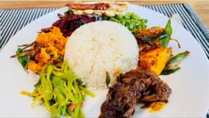 At Spring Villas, they serve it alongside spicy chicken or fish curry, bursting with rich roasted spices and a hint of heat, and seeni sambol, a sweet-and-spicy onion relish slow-cooked with dried chilies, curry leaves, and just the right touch of jaggery. The combination is nothing short of magical—the creamy, mellow rice balancing the fiery curry and the caramelized sweetness of the sambol, creating a harmony of flavors that lingers on your palate.